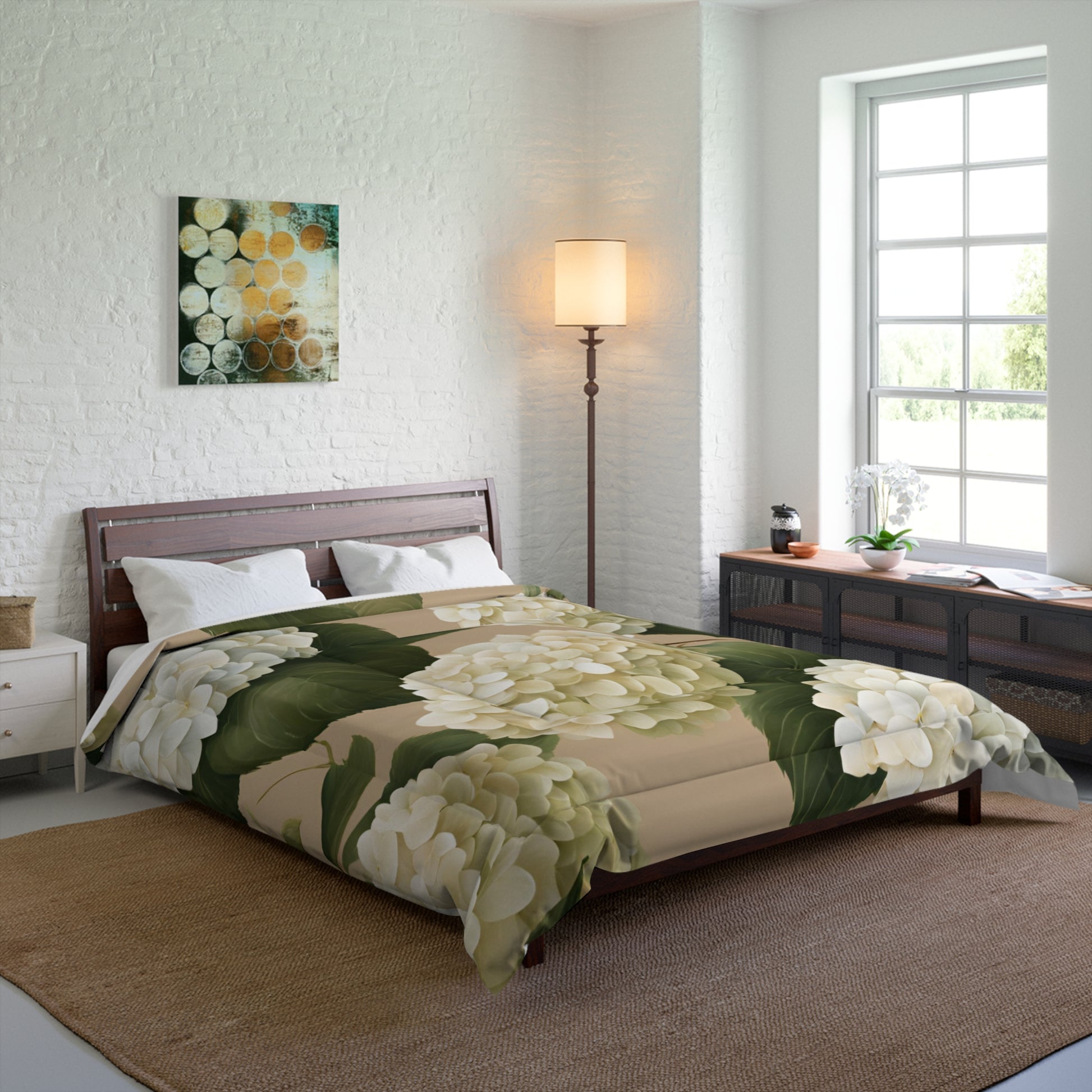 Tan and White Hydrangea Floral Comforter